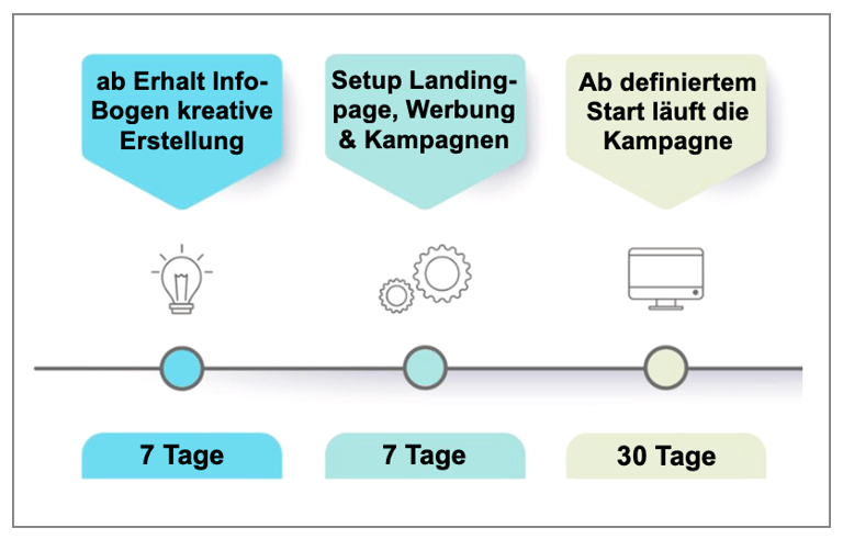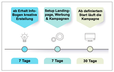 Wenn uns der ausgefüllte Fragebogen vorliegt, dann benötigen wir ab dem Zeitpunkt ca. eine Woche für die Erstellung der kreativen Inhalte für die spezielle Landingpage für Sie und für die Inhalte und Bilder für die Werbekampagne.